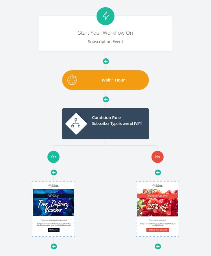 Al igual que las campañas de goteo, Workflows o flujos de trabajo permiten que los mensajes salgan en momentos específicos y con retrasos estratégicos. Pero cuando se combinan con activadores condicionales y la gestión inteligente de bases de datos, Workflows pueden también, enviar mensajes basados en caracterísitcas muy personales tales como comportamiento, ubicación o información personal; adaptando efectivamente el contenido del correo electrónico o mensaje de texto para las diferentes audiencias.